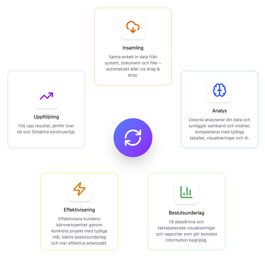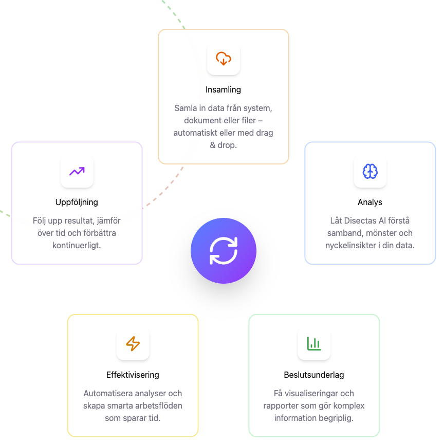 Kör crossfunktionella analyser över strukturerad data, tidsbaserad data och referensdokumentation med Disectas AI.